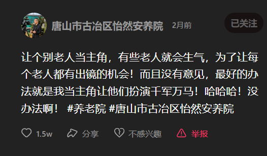 一开始,养老院来的老人都是被动来的,如今,很多老人都是看到短视频之后,主动来怡然养老。