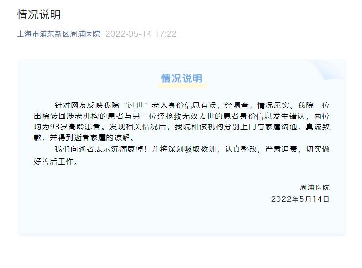 据上海市浦东新区周浦医院微信公众号消息,上海周浦医院14日发布情况说明指,针对网友反映上海周浦医院“过世”老人身份信息有误,经调查,情况属实。