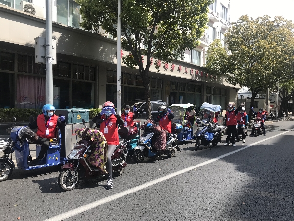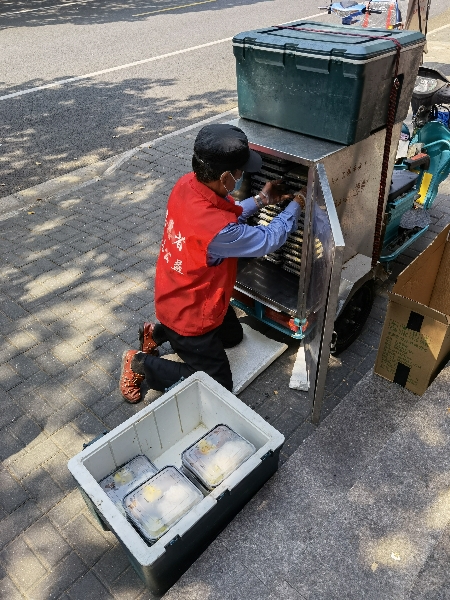 出锅、装盒、打包、装车,彭浦镇老年食堂的送餐员穿上防护服,在张陆妹带领下,开着送餐车,按照特定路线出发送到各小区,再由小区志愿者接力送到每一位老人手中。从春天到夏天,两个月来,这样的爱心故事天天上演……