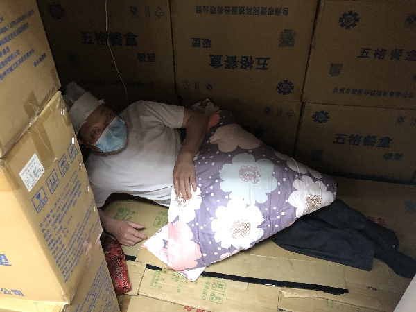 出于防控疫情的需要,静态管理期间,彭浦镇老年食堂的员工都必须吃住在食堂里,可临时又找不到那么多的板床,而且地方小,摆不开,员工们只能有的睡行军床,有的在地板上铺上废弃的纸板当床垫,四周再围上几个纸板,搭建一个“鸽子窝”。在食堂的各个角落,这样的“鸽子窝”随处可见。