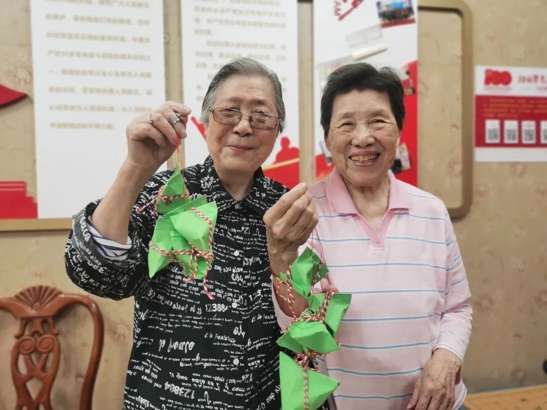 每年端午节一起包粽子是颐养第二敬老院的一项传统。今年由于疫情防控,院方将这一传统改变为“包粽纸”。一张绿色的彩纸经过折叠、塑形,绑上红丝带后,活脱脱像一只真的粽子。