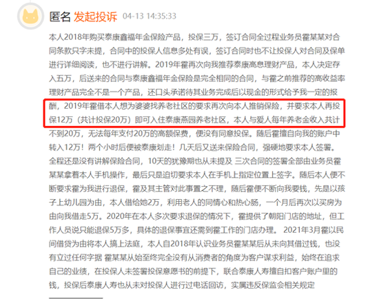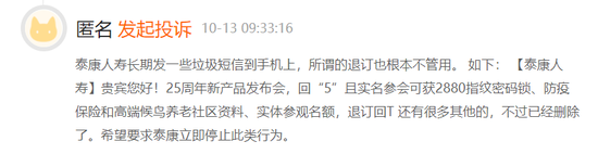 一些人对保险推销手法不胜其烦,“忍无可忍”,在黑猫上发起投诉,称“经常接到泰康保险的电话轰炸”,或者长期给客户发送短息,称送鸡蛋、送防疫保险,送指纹密码锁等,邀请实体参观高端养老社区。