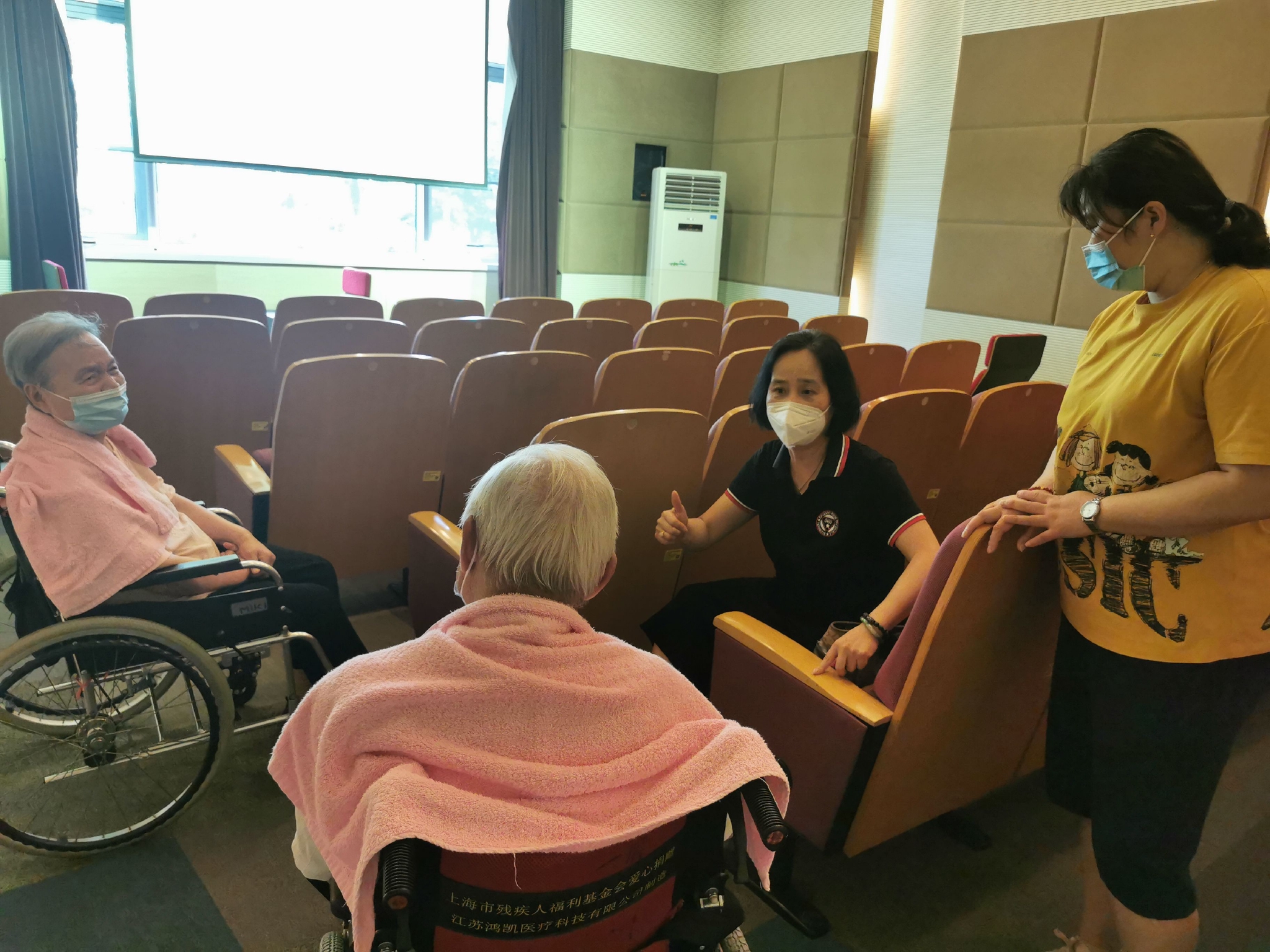 虽然养老机构开放探视,但为了好好守住“安全大门”,大多机构依旧设置了探访时间。青浦区中福会养老院根据自身情况,设置了“一小时”探访时间。“我们在同一时间开放了5个探视点,包括影视厅、接待室等,”中福会养老院党支部书记、副院长詹黎介绍说,这样一来,探视家属们彼此之间保持安全距离,也让老人与家属在私密空间聊得更尽兴。