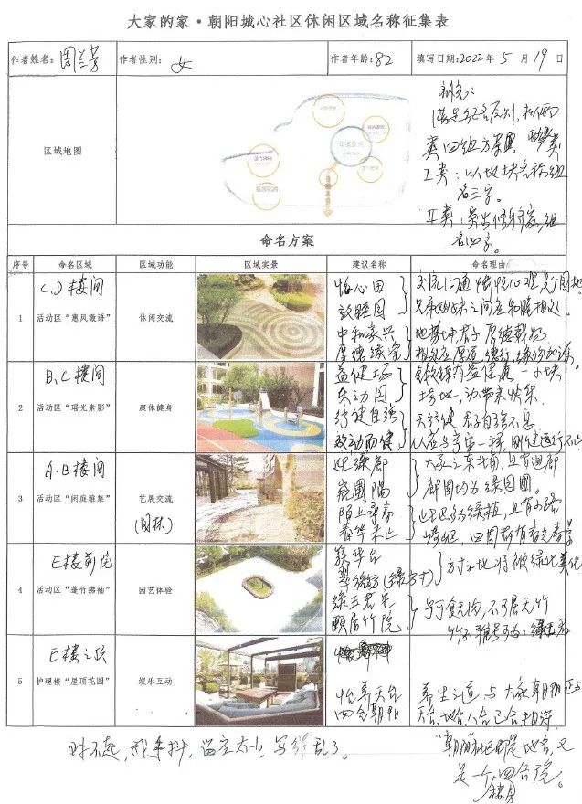 这是来自82岁周兰芳奶奶的方案:周兰芳奶奶的休闲区域名称征集手稿 ▼