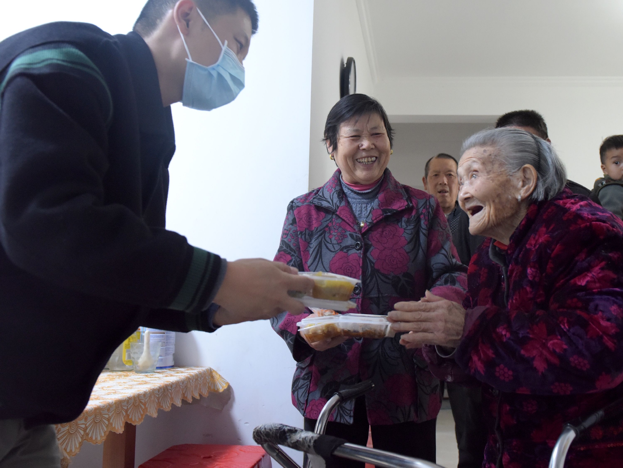 11月22日,安徽省合肥市肥东县店埠镇迎河家园内,肥东县老年助餐服务中心经理李杰(左)在给102岁的老人朱广珍(右一)送上午餐。新华社记者 郭晨 摄