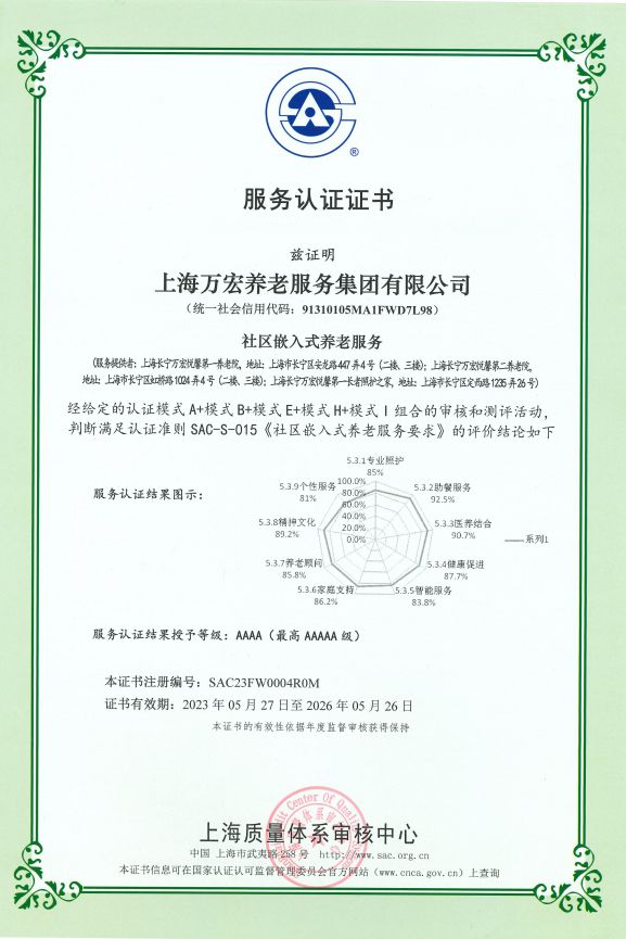 获得“上海品牌”认证的企业具有“品牌引领、自主创新、品质卓越、管理精细、社会责任”等特点。万宏养老集团自成立以来,在区国资委、区民政局、区市监局等部门的指导支持下,坚持做有温度的养老和做好家门口的养老服务,始终围绕“万宏养老”品牌建设,2021年度获得“社区嵌入式”养老服务上海市标准化试点项目;2022年10月发布“社区嵌入式养老服务要求”团体标准;2023年6月“社区嵌入式养老服务”成功获得“上海品牌”认证。