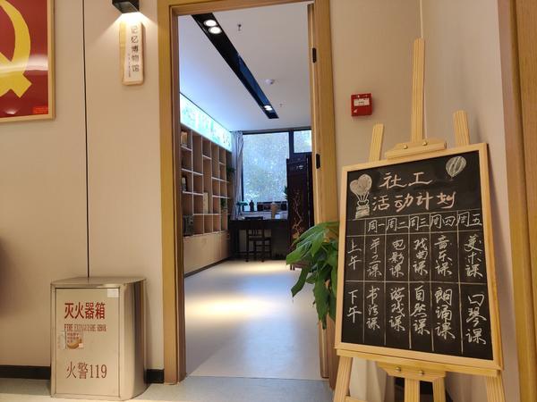 不远处的活动中心还张贴着“社工活动安排表”,其中有手工课、书法课、朗诵课和美术课等。