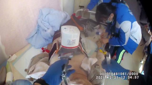 近日,沈阳急救中心大东一分中心再次响起出诊铃声——“你辖区内某养老院一老人急需抢救,请迅速出诊。”此时已是中午12点14分。收到指令后,荆涛急救小组的成员们立刻放下手中的午饭,呼啸的警报声中急救车奔赴又一个急救现场。荆医生立刻通过车载电话进行联系,与养老院工作人员沟通时发现患者极有可能出现心脏骤停,他立刻指导现场人员开始帮助患者清理口内异物,进行胸外按压。