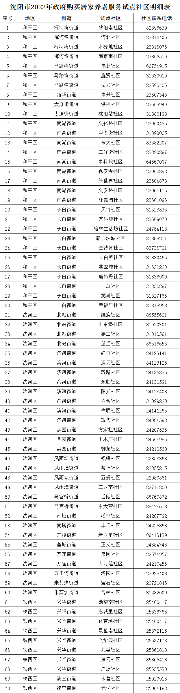 去年起,沈阳在100个社区开展政府购买居家养老服务试点工作,依托社会力量向符合条件的高龄、失能、失智、贫困、计划生育特殊家庭中的老年人提供理发、助浴、送餐、制作老年餐、室内清洁、助行、起居照料、失禁清理、生活自理能力训练9项免费居家养老服务。