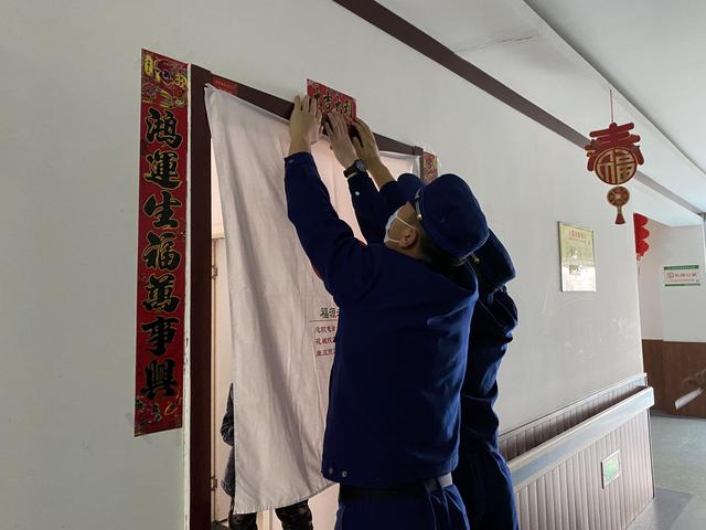 图为“蓝朋友”志愿服务队工作人员正在贴对联。