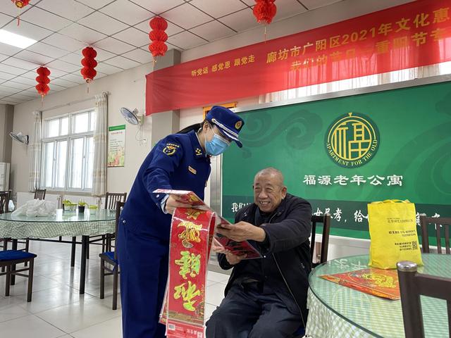春节前夕,为践行为人民服务的宗旨,弘扬尊老敬老的传统美德,河北廊坊消防蓝朋友志愿服务队走进养老院,为老人们送去暖心服务。梳头发、剪指甲、打扫卫生、包饺子、唠家常,并为老人们送去了春联和福字,以实际行动向老人们致以最真挚的问候与祝福。