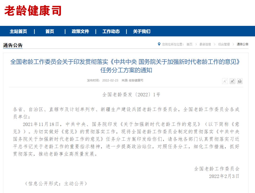 据国家卫健委网站23日消息,全国老龄工作委员会印发贯彻落实《中共中央国务院关于加强新时代老龄工作的意见》任务分工方案。