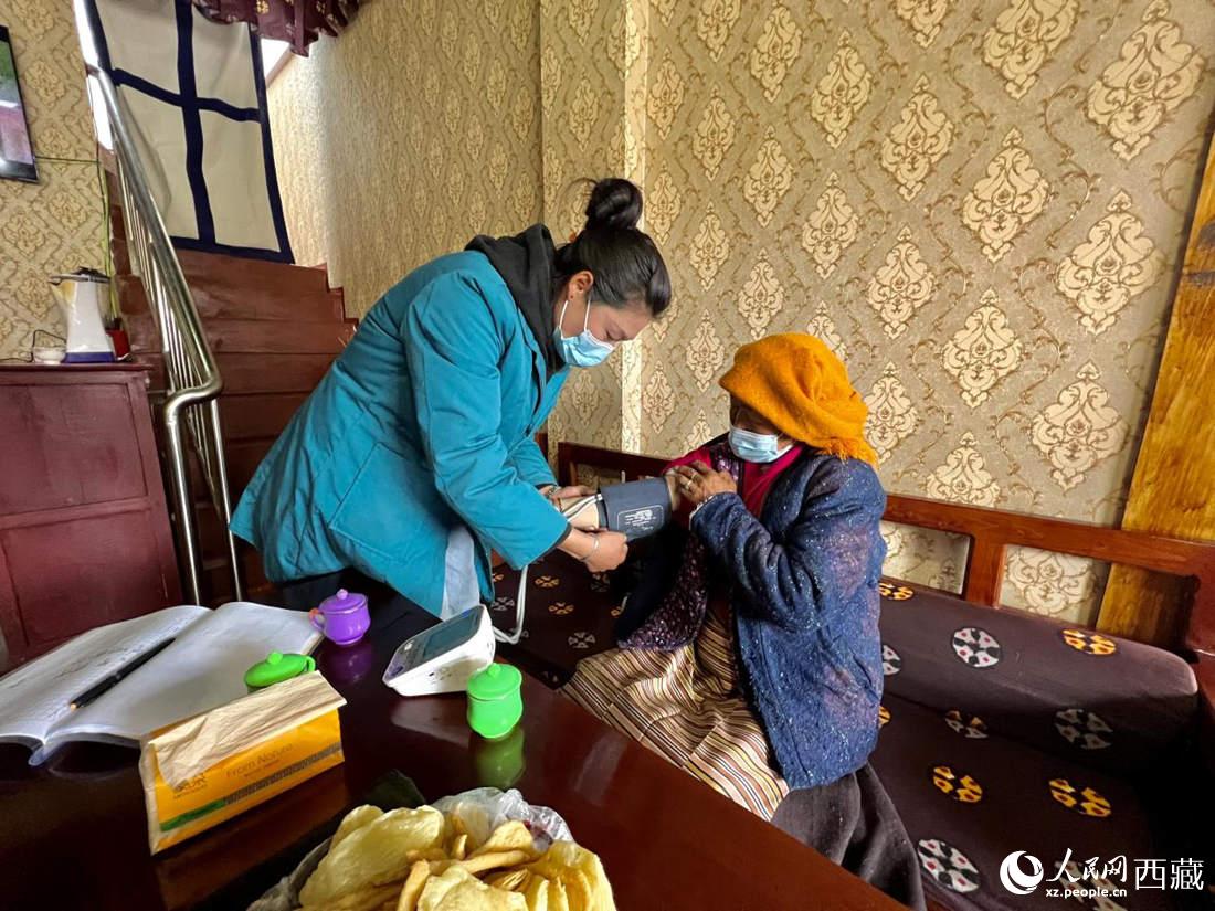 医护人员为老人定期测量血压。人民网 次仁罗布摄