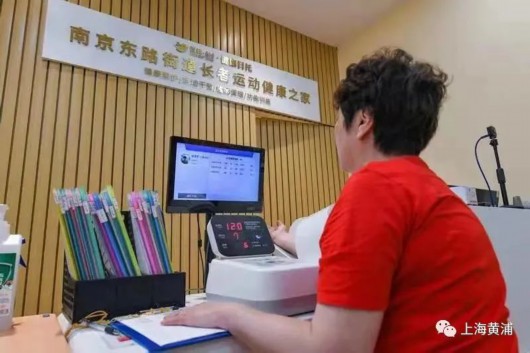 在南京东路街道长者运动健康之家前台的体侧仪器来一套“实时健康体检”,是来这里锻炼的阿姨爷叔进门的第一件事
