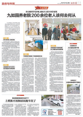 位于朝阳区江南文化创意产业园内的九如园养老院因资金问题经营陷入困境,200余位老人担心停电停暖,想离开又要不回已经交付的养老钱。去年底,本报以《九如园养老院200余位老人该何去何从》为题,对此事进行了报道。报道刊发后,市区乡多级部门第一时间介入,协调、督促养老院所租用房产的开发及建设等相关方,共同解决老人遇到的难题。