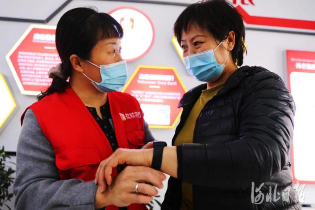 2022年4月17日,河北省张家口市桥东区红旗楼街道工西社区养老服务站工作人员为居民介绍紧急呼叫器使用方法。