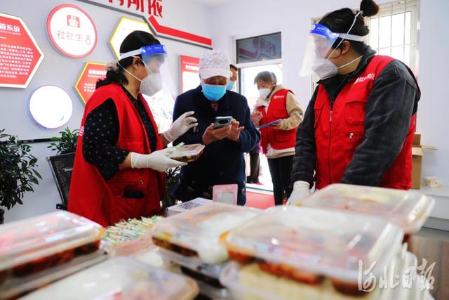 2022年4月17日,河北省张家口市桥东区红旗楼街道工西社区养老服务站工作人员为居民配发午餐,午餐由中央厨房集中配送。