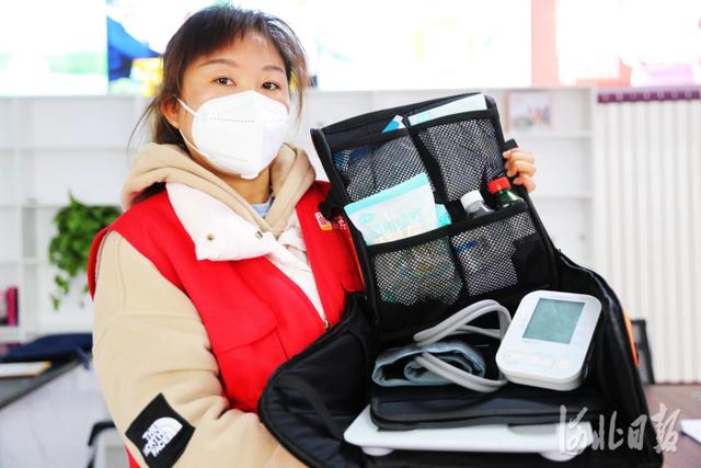 2022年4月17日,河北省张家口市桥东区红旗楼街道工西社区养老服务站工作人员展示便携式常规体检仪器包。
