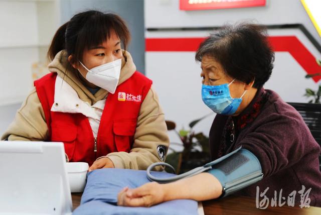 2022年4月17日,河北省张家口市桥东区红旗楼街道工西社区养老服务站工作人员为居民测量血压。
