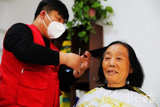 2022年4月17日,河北省张家口市桥东区红旗楼街道工西社区养老服务站工作人员为居民理发,服务站理发收费为市场价的50%。