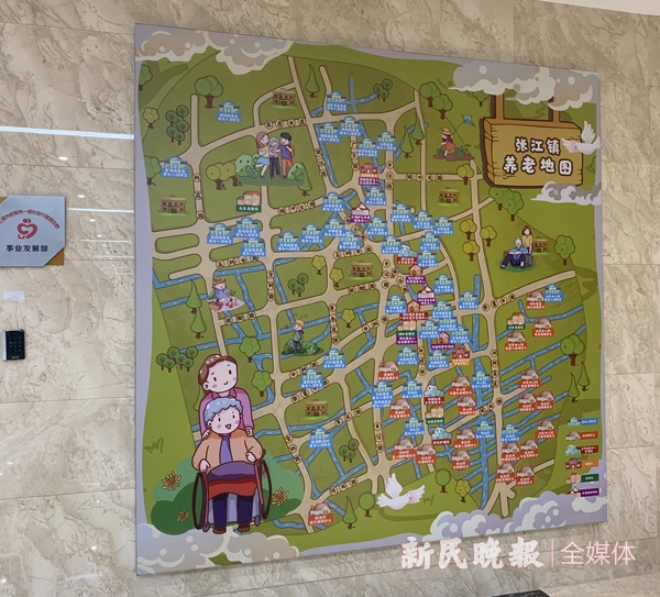 在张江镇为老服务一体化运行管理中心,记者看到,墙上悬挂着一幅“萌萌哒”养老地图,用卡通画的方式绘出张江镇养老设施的“养老地图”,其中包括老年人活动室、老年人日间活动中心、张江社区卫生服务中心、养老院等。