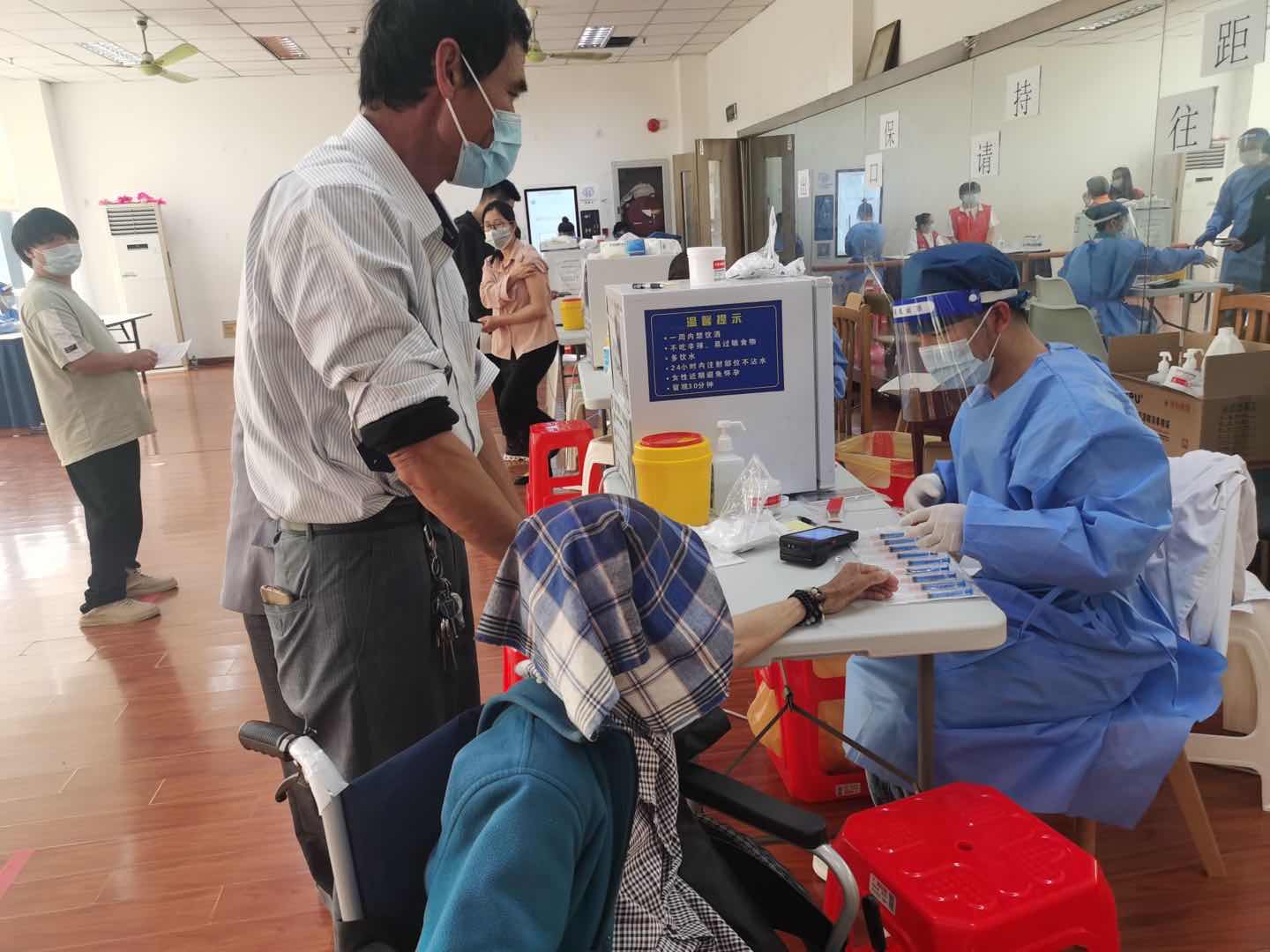 蒋庄村叶阿公今年94岁,原来对接种新冠疫苗有顾虑,认为自己年纪大了没有必要打,村干部了解情况后和其家属先进行了沟通,家属表示支持老人接种,后来在其儿子动员下在蒋庄村疫苗接种专场完成了第一针接种。村干部说:“现在很多老人的家属都很支持疫苗接种工作,我们上门宣传后,他们都主动作老人思想工作。”