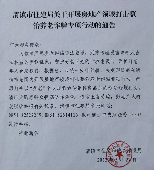 通告显示,为依法严惩养老诈骗违法犯罪,延伸治理侵害老年人合法权益的涉诈乱象,守护好老百姓的“养老钱”,维护好老年人合法权益,根据省、市统一安排部署,决定5月27日起在清镇市范图内开展房地产领域打击整治养老诈骗专项行动,严厉打击以“养老”名义虚假宣传销售商品房的违法违规行为,请广大购房群众提高防诈意识,谨防上当受骗,鼓励广大群众积极举报有关线索。