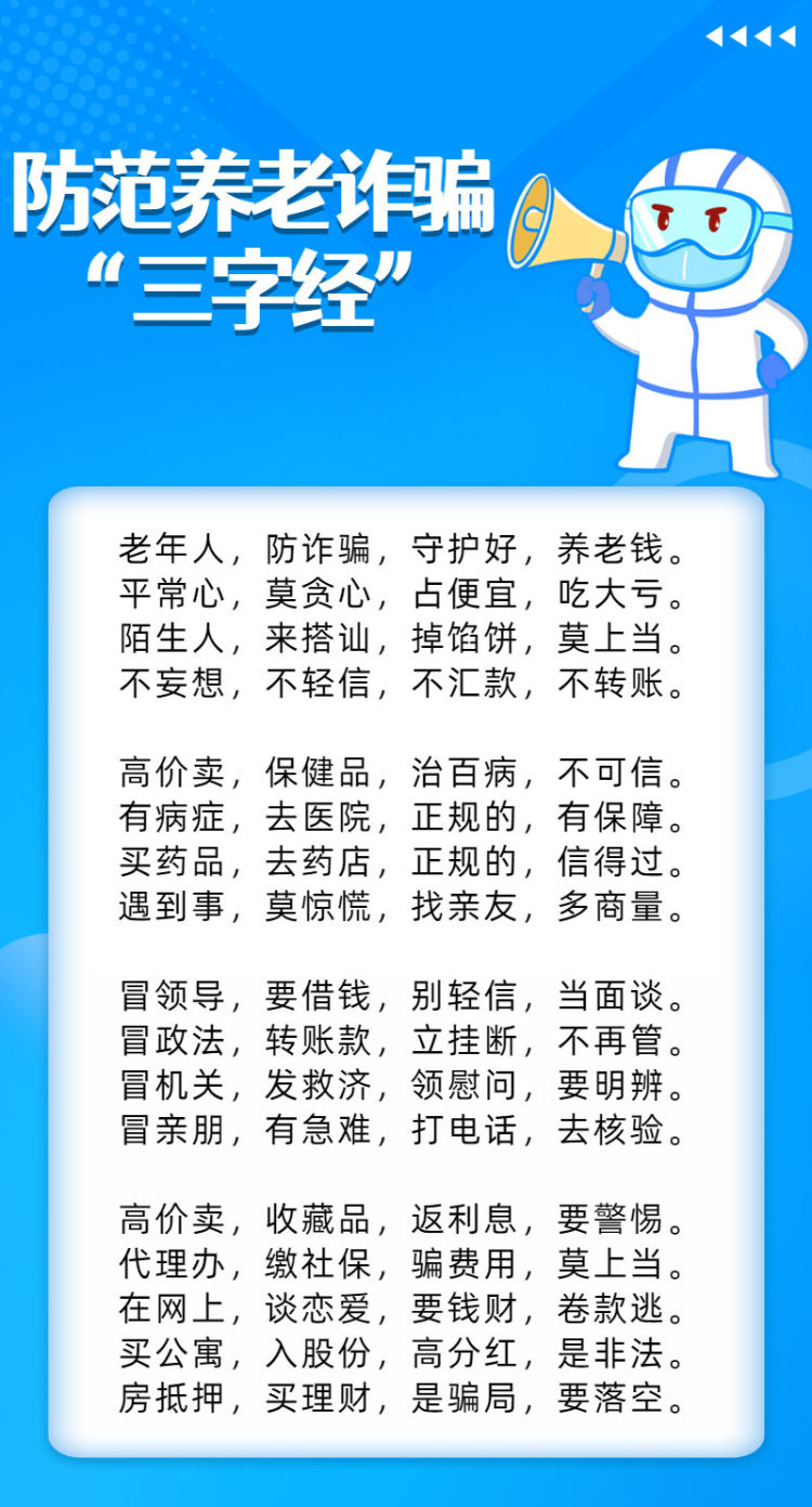 据悉,不断翻新的养老骗局打乱了不少长者的生活节奏,让长者不仅遭受财产损失,更影响了晚年幸福生活。为有效维护老年人合法权益,全力守护好广大老年朋友的“钱袋子”,福田区精心编制了浅显易懂易记的“三字经”,助力打击整治养老诈骗犯罪,护好福田人的幸福家。