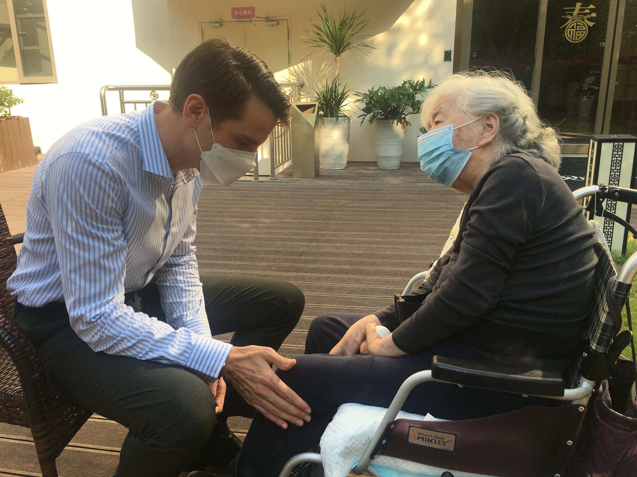 4月20日,招商高利泽蛇口颐养中心内,法国康复师正在为一名长者做腿部康复。(采访对象供图)