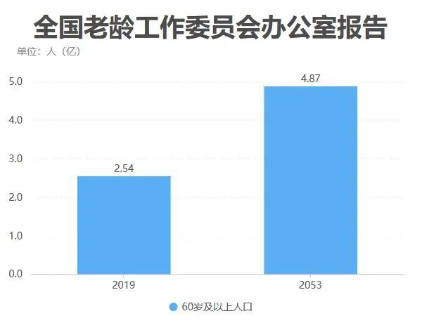 全国老龄工作委员会办公室的报告显示,截至2019年底,我国60岁及以上人口达2.54亿,预计到2053年,中国老年人口将达到4.87亿的峰值,占总人口的34.9%,也就是说,每3个人当中就有1个是老年人。