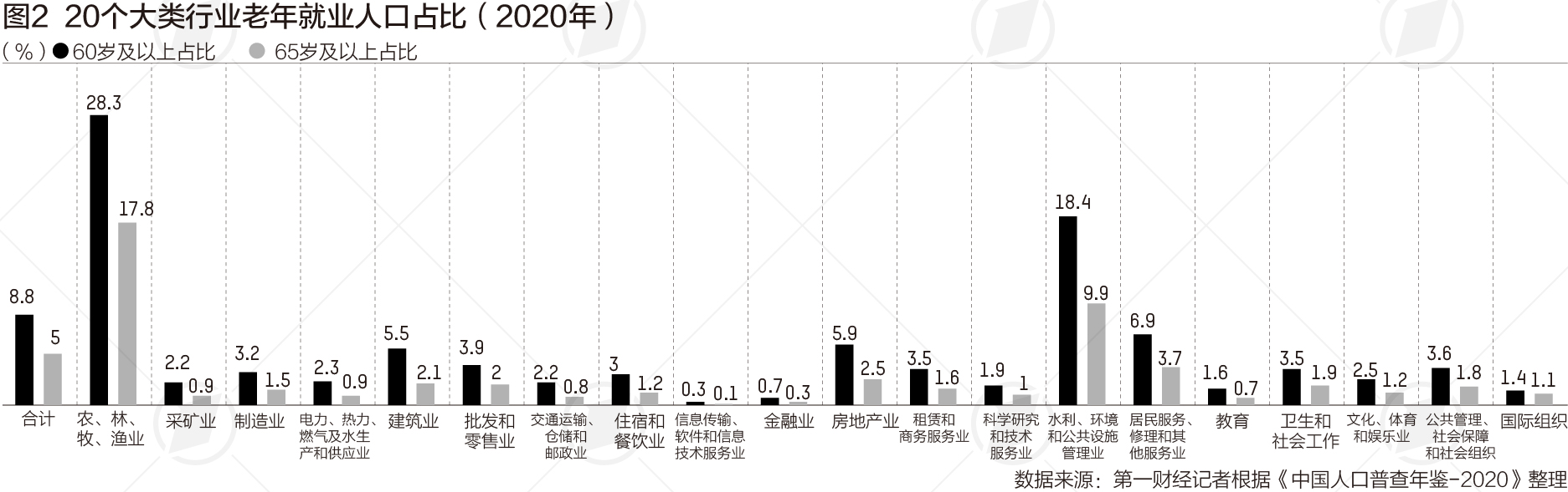老年就业人口主要从事什么行业?第一财经记者根据前述年鉴计算,我国各大行业的就业人员中,老年人口占比最高的是农林牧渔业,占比高达28.3%,其次是水利、环境和公共设施管理业,这一占比达到18.4%。