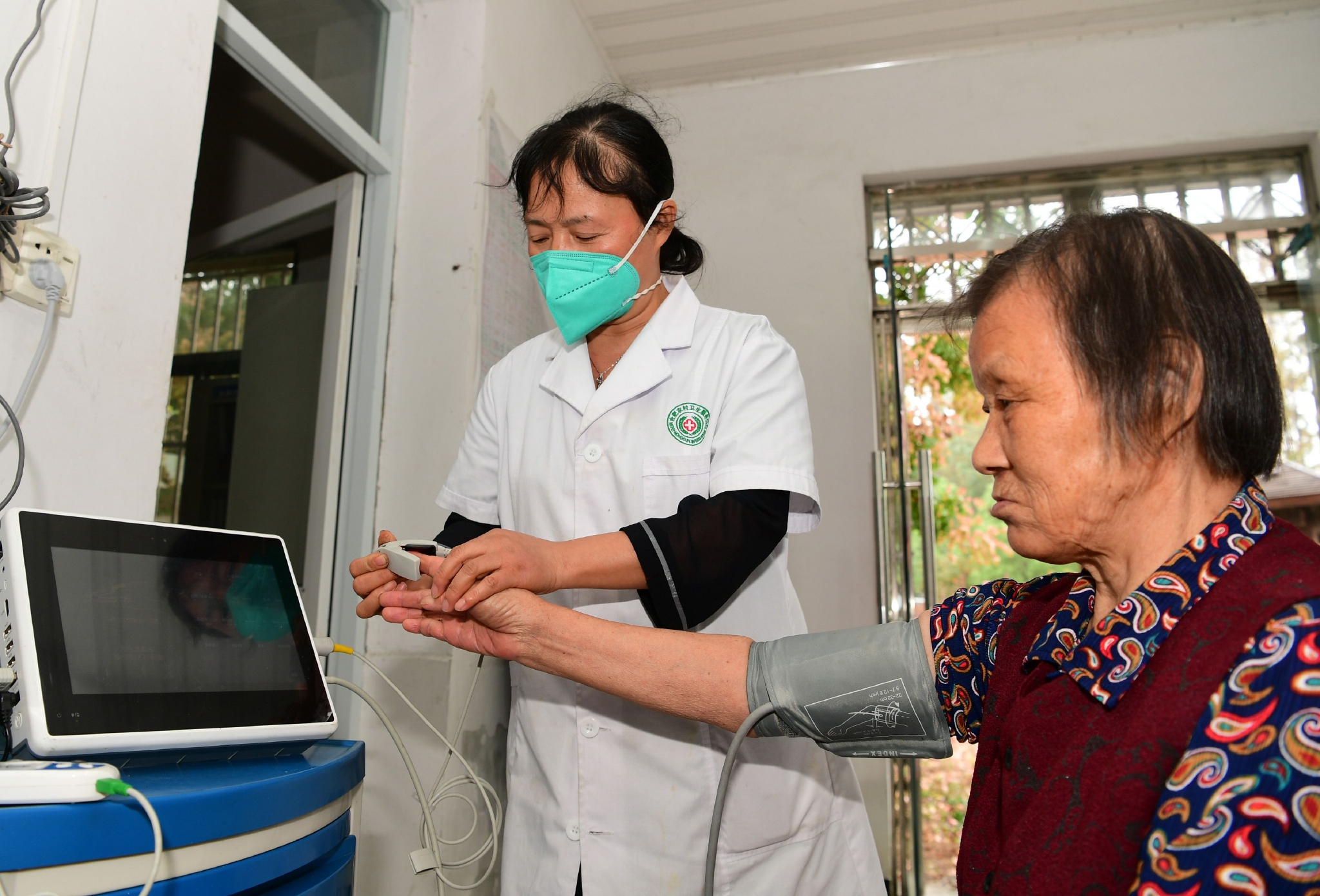 10月4日,在肥西县丰乐镇新仓养老服务中心,医护人员使用健康一体机为老人体检。新华社发(徐勇摄)