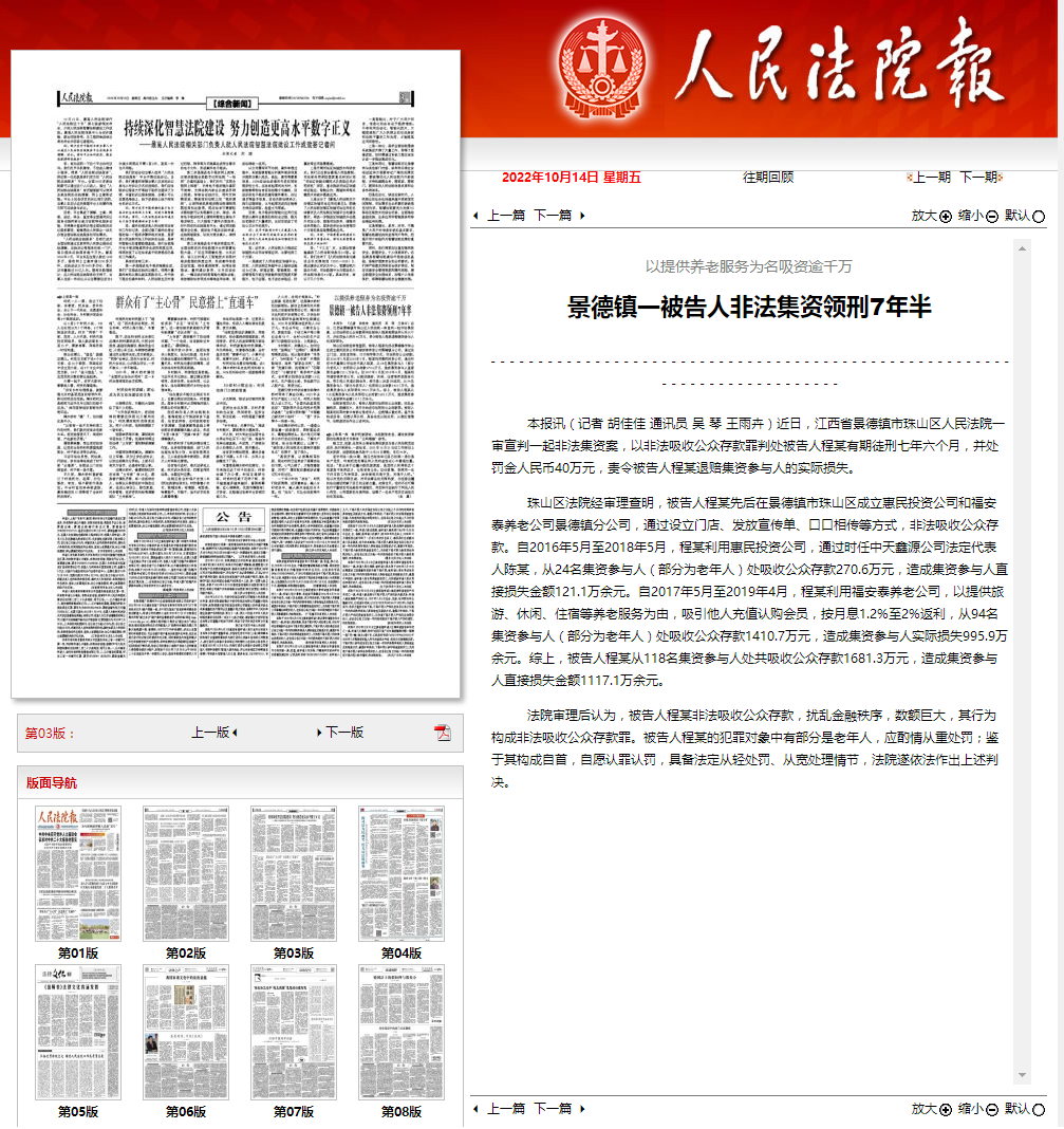 近日,江西省景德镇市珠山区人民法院一审宣判一起非法集资案,以非法吸收公众存款罪判处被告人程某有期徒刑七年六个月,并处罚金人民币40万元,责令被告人程某退赔集资参与人的实际损失。