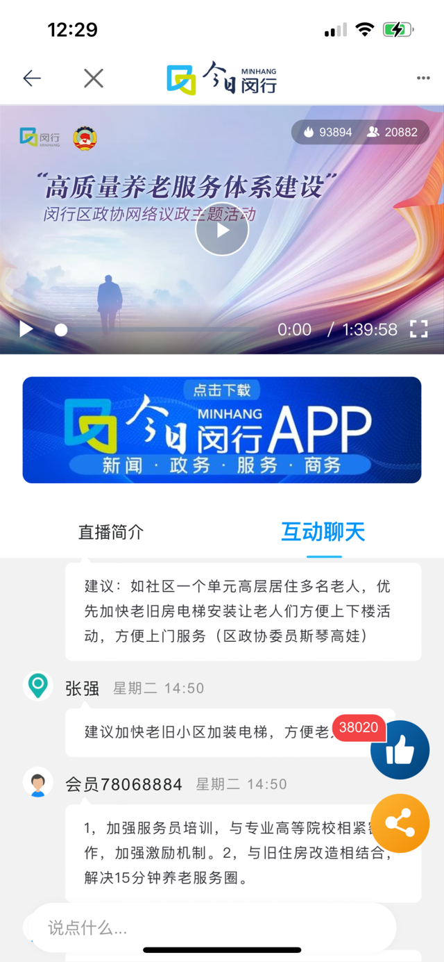 当日,区融媒体中心和阿基米德传媒进行全程网络实况直播,众多网友在互动聊天区参与讨论交流并留下真知灼见。议政会开始没多久,“今日闵行”APP直播间,网友们智慧的火花就不断翻滚出现:“养老服务质量应物质与精神同步提升,要关注老人精神文化需求”“要尽快推广居家智能设备,照护到更多有需要的群体”“要梳理积极老龄化、有为老龄化的发展理念”……这些来自民间的金点子从不同角度为养老问题提供思路,获得不少点赞。据统计,本次直播在线观看人数超5万人次。