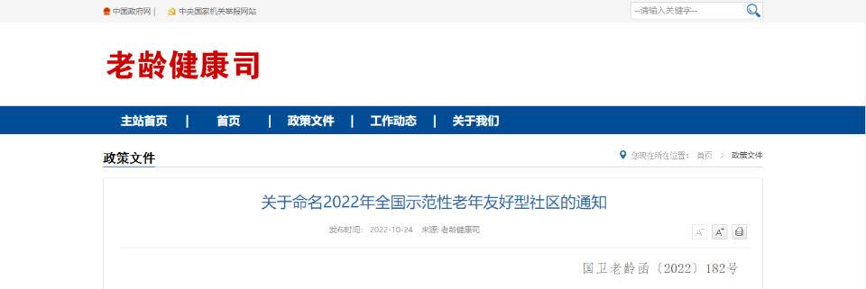 近日,国家卫生健康委和全国老龄办联合发布《关于命名2022年全国示范性老年友好型社区的