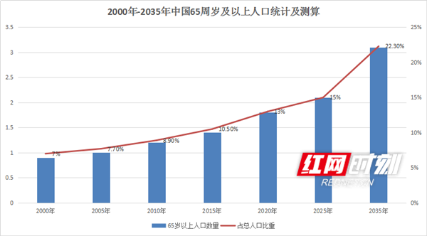 据中国发展基金会发布的《中国发展报告2020:中国人口老龄化的发展趋势和政策》测算,2020年中国65岁及以上的老年人约有1.8亿,约占总人口的13%;2025年“十四五”规划完成时,65岁及以上的老年人将超过2.1亿,占总人口数的约15%;2035年和2050年时,中国65岁及以上的老年人将达到3.1亿和接近3.8亿。