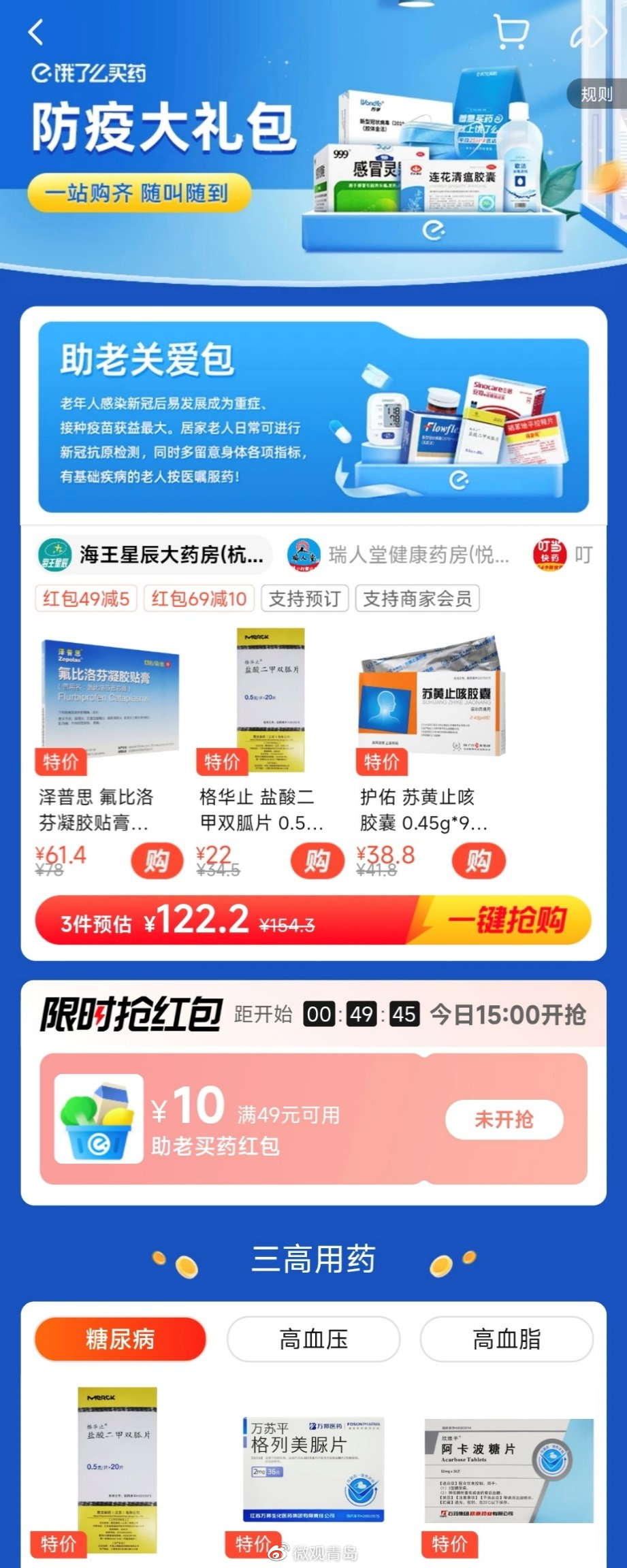 针对老年人基础病备药需求,12月9日饿了么宣布启动“防疫助老”专项计划,提出多项举措帮助老年人足不出户地购买常用药,年轻用户也可进入指定会场为身边老年人居家多做一些物资准备。
