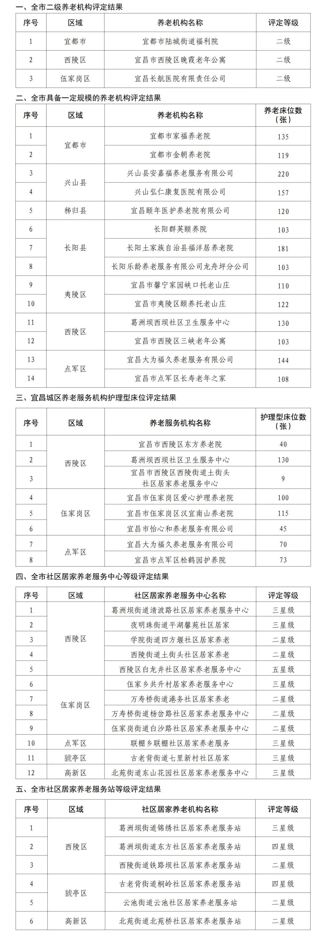 近年来,宜昌市民政局在养老贯标服务上持续下功夫,首次制定了《宜昌市社区居家养老服务中心(站)等级评定办法(试行)》,建立了全市统一的等级评定标准,鼓励更多的养老服务机构争先创优,以评促建,努力打造一批环境适宜、设施齐备、管理规范、服务专业的养老服务示范机构,不断提升服务老年人的能力和水平。此次经养老服务机构自主申报、各县市区民政局资格审查、第三方专业机构实地评估、养老机构等级评定委员会评审及相关网站公示后进行通报。