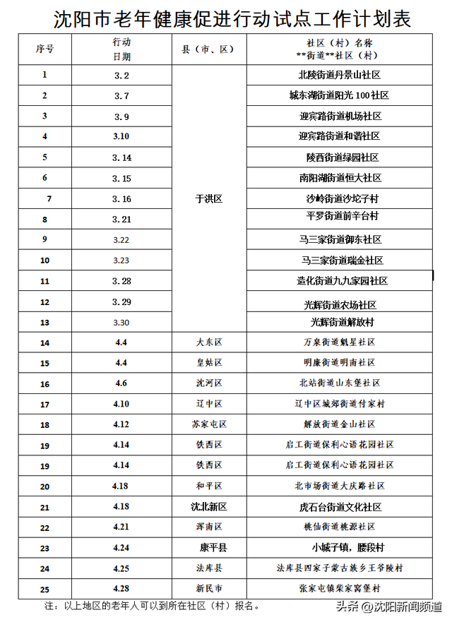 沈阳市老年健康促进行动试点工作于2023年3月2日正式启动,陆续走进25个试点社区(村)开展老年健康促进行动,行动包括三个项目组:老年心理关爱行动组、老年肠道健康促进行动组、老年人失能失智预防干预组。