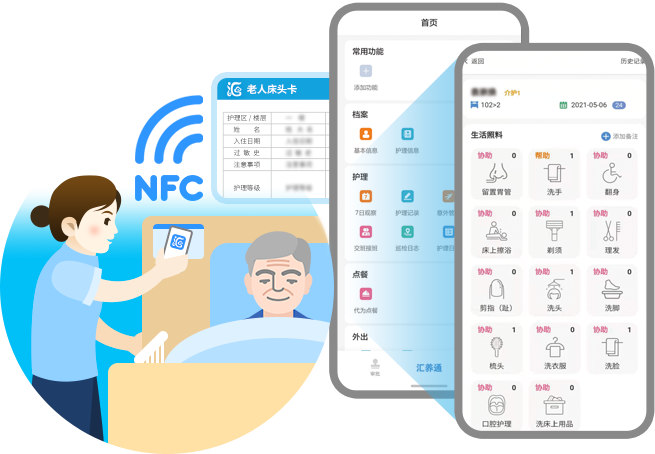 护理员可在APP端查看当日护理工作,待进入老人房间后,通过NFC技术确认老人所需的护理项目,护理完毕后快速生成护理记录。另外,平台还支持语音交接班、智能设备互联等,若遇老人突发状况,护理员及机构大屏可及时收到信息提醒。