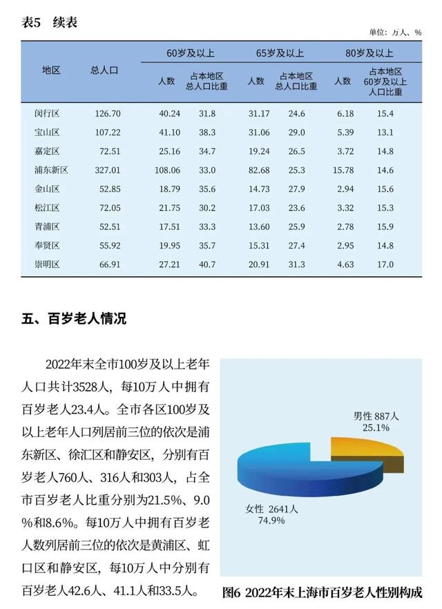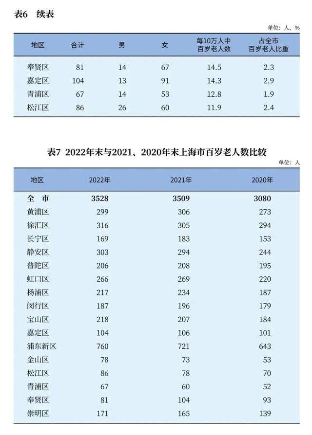 上海市卫健委近期发布2022年上海市老年人口和老龄事业监测统计信息:截至2022年12月31日,上海市户籍人口中100岁及以上老年人口3528人,其中男性887人,女性2641人。2022年上海市人口预期寿命为83.18岁,其中男性80.84岁,女性85.66岁。上海市各区100岁及以上老年人口列居前三位的依次是浦东、徐汇、静安。每10万人中拥有百岁老人数列居前三位的依次是黄浦、虹口、静安。详见↓