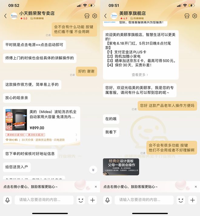 那么具体到实际使用中这些产品是否真的对老年人很友好呢?带着这一问题,中国家电网记者在某电商平台上搜索“老人家电”产品,分别咨询了两款排序较前产品的客服人员,其客服均给出“老年人简单易上手”的回复,同时其中一家客服还表示,在上门安装时工作人员会对产品进行具体操作讲解。而这一点,也是记者在走访一些家电大卖场时,大多数销售员都会提到的服务之一,“不过,老年人一般需要反复教学,可能第一次教会了,后面又忘了。”某大卖场销售人员说,很多老年人对现在的家电产品有一种本能的“怵”的心理,认为自己学不会智能化家电产品。