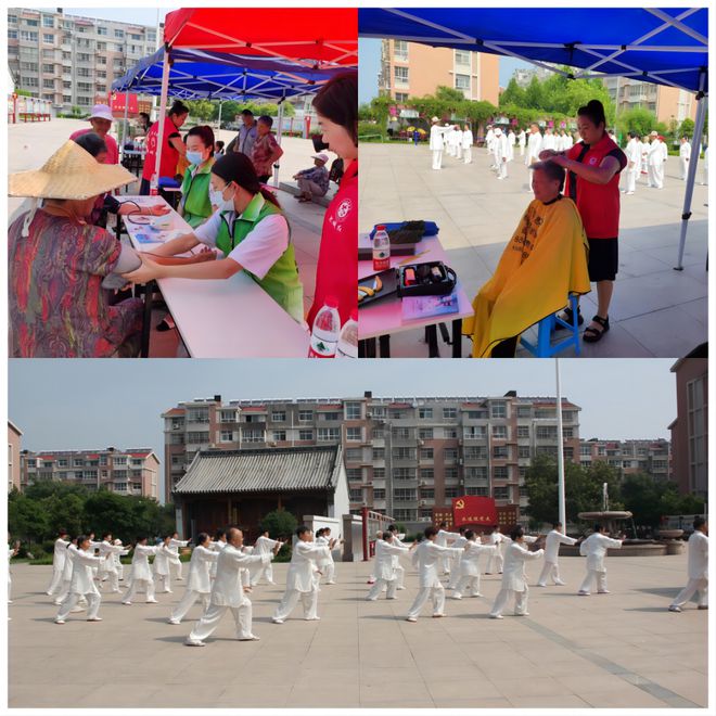 启动仪式后,孙庄社区老年太极拳队伍进行了表演;新城街道社区卫生服务中心医护人员现场开展老年健康知识咨询和义诊服务,志愿者向老年人发放健康手册,宣传老年健康知识;爱心义剪工作人员免费为老人理发。
