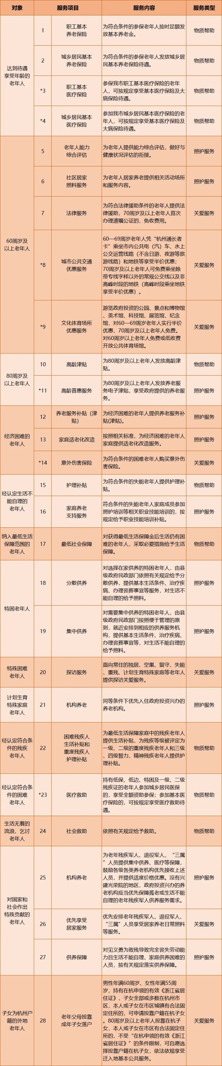 在浙江省级清单13类人群21项服务的基础上,杭州市清单内容扩展至14类人群28项服务。老年人可以享受哪些基本养老服务?点开这份清单看一看!