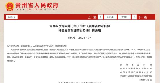 政策名称:《贵州省养老机构预收资金管理暂行办法》