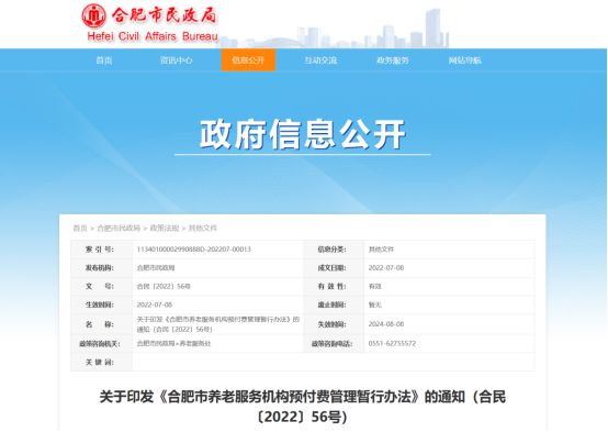政策名称:《合肥市养老服务机构预付费管理暂行办法》