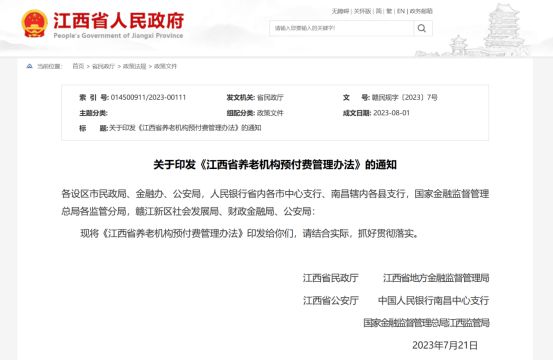 政策名称:《江西省养老机构预付费管理办法》