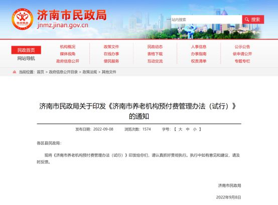 政策名称:《济南市养老机构预付费管理办法(试行)》