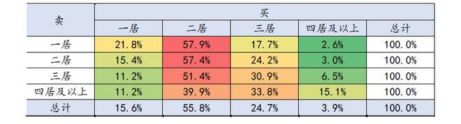 北京市老年居民在进行房屋置换时,卖出一居室后,57.9%的居民选择扩增至两居室;原居住两居的业主在置换后仍然有57.4%居民继续选择购买两居室;而三居室业主置换后,有51.4%居民“降级”为两居室;在四居室业主中,同样有39.9%置换了两居室。