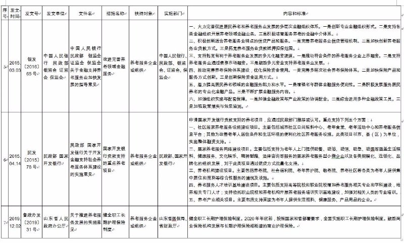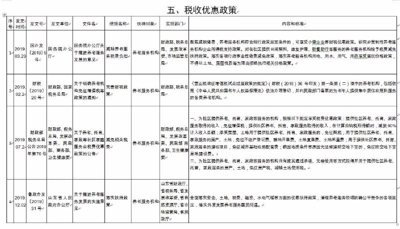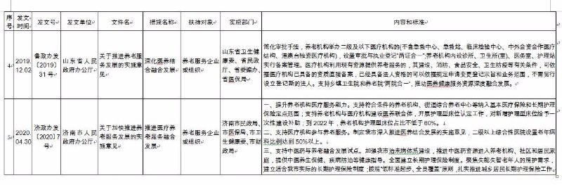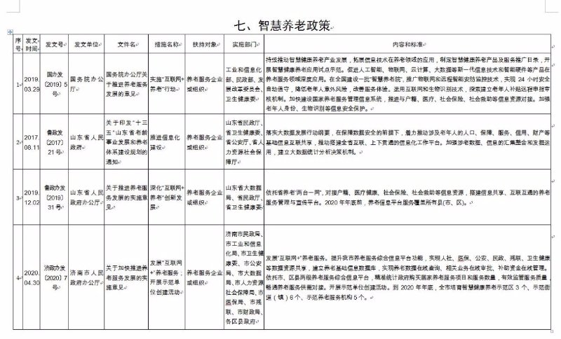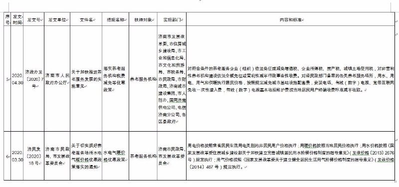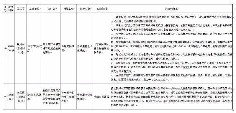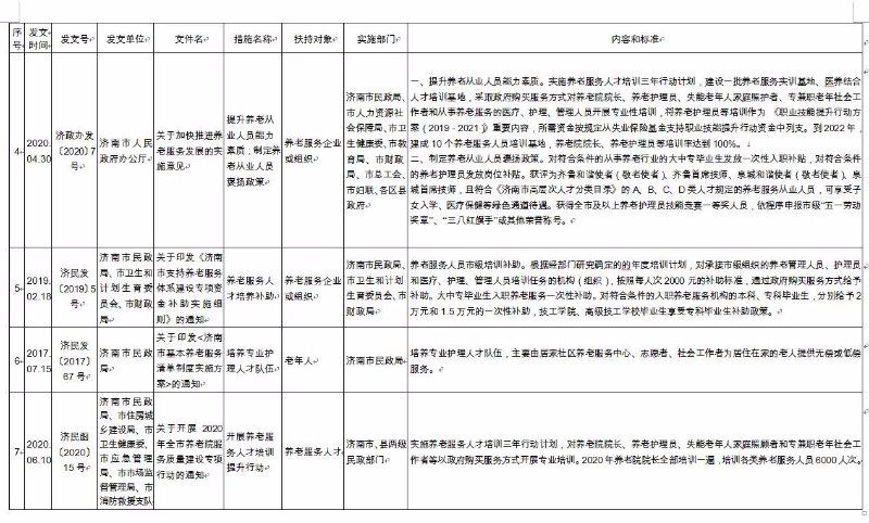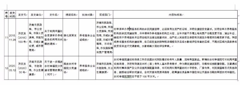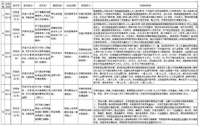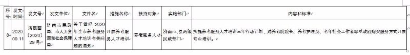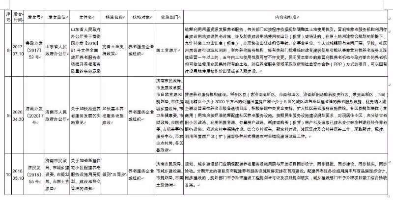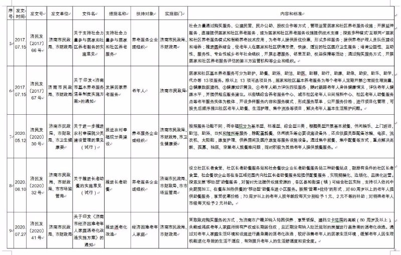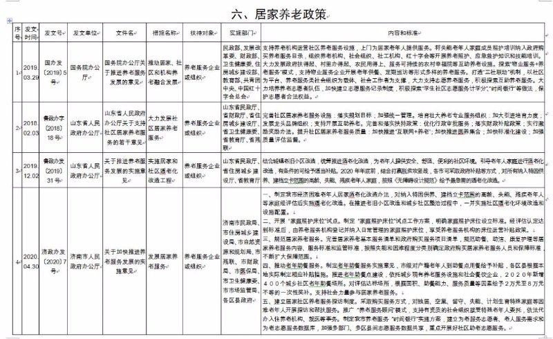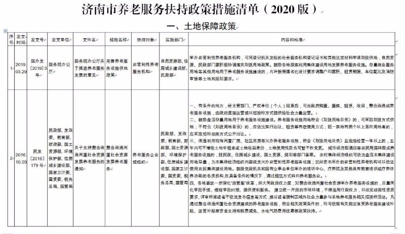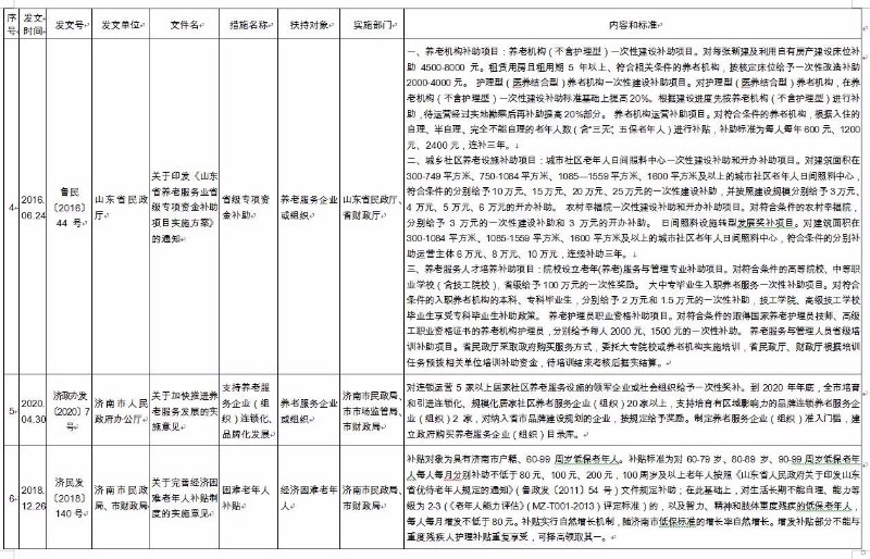 《济南市养老服务扶持政策措施清单》(2020版),共包含8大类、65项政策文件。分别为:一是土地保障政策,包含12项政策文件;二是政府补助补贴政策,包含12项政策文件;三是人才培养和就业政策,包含8项政策文件;四是金融保险支持政策,包含9项政策文件;五是税收优惠政策,包含6项政策文件;六是居家养老政策,包含9项政策文件;七是智慧养老政策,包含4项政策文件;八是医养结合政策,包含5项政策文件。每项政策文件都详细公布了发文时间、发文号、发文单位、文件名、措施名称、扶持对象、实施部门、内容和标准,为养老服务企业(组织)全面掌握相关政策文件,提供了最全面的参考和依据。